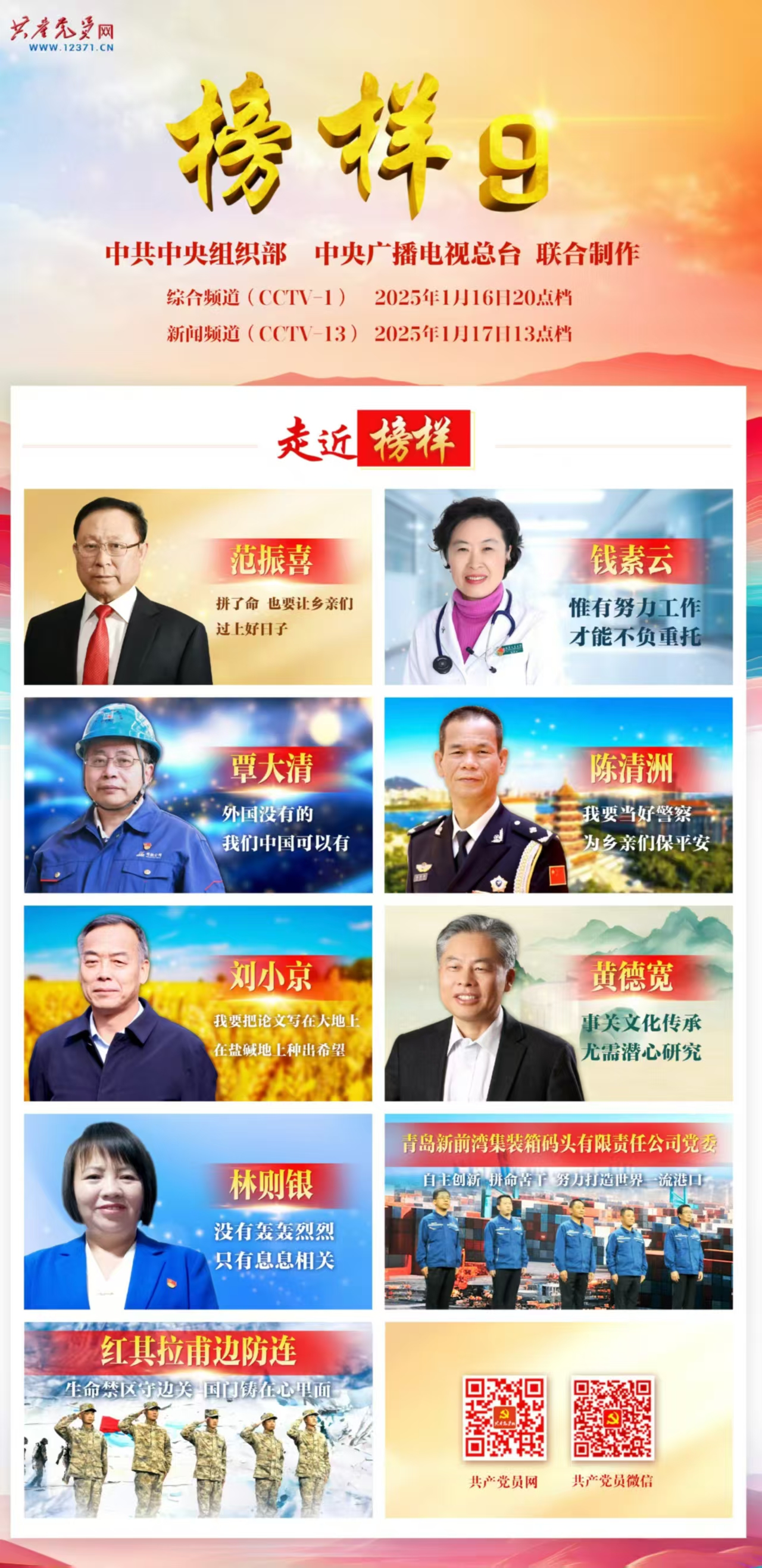 為深入學習貫徹習近平新時代中國特色社會主義思想和黨的二十屆三中全會精神,教育引導基層黨組織和廣大黨員干部學習榜樣、爭當先進,積極投身中國式現代化建設,中央組織部、中央廣播電視總臺聯合制作了《榜樣9》專題節目。節目邀請范振喜、錢素云、覃大清、陳清洲、劉小京、黃德寬、林則銀7名黨員和山東青島新前灣集裝箱碼頭公司黨委、陸軍某邊防團紅其拉甫邊防連參加錄制,通過典型事跡展示、現場訪談、重溫入黨志愿書等形式,生動展現學習踐行習近平新時代中國特色社會主義思想突出事跡,以及堅定信念、踐行宗旨、改革創新、擔當作為的高尚品質和精神風范,彰顯基層黨組織戰斗堡壘作用和黨員先鋒模范作用。
